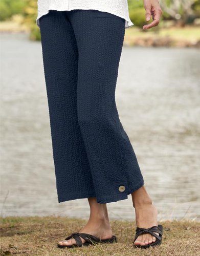 Always on the hunt for the best fabrics and styles, our globe-hopping buyers sought an easy, lightweight fabric that would emerge crisp and fresh after hours in a tightly packed suitcase. The solution, our innovative, subtly puckered Scrunch Cloth, has become our customers' favorite travel fabric as well. It simply will not wrinkle, packs down to nothing, and is remarkably easy to care for. A stylish update with wide legs accented with a cute button detail at the hem. Full elastic waist and roomy front pockets. Ladies capri pants in black, navy. Rayon/polyester/spandex. Washable. Imported. Sizes: XS(4), S(6-8), M(10-12), L(14-16), XL(18-20); 25" inseam.